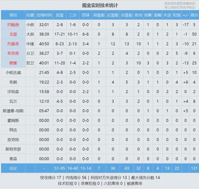 约基奇毫无斗志,防挡拆不断被库里针对。此役约老师投篮23中8,三分13中2,罚球4中3,得到21分13板10助1帽,正负值-10。掘金新援卡梅伦-约翰逊出战32分钟,投篮8中2,三分6中1,仅拿5分3板2助,正负值-17全场最低。