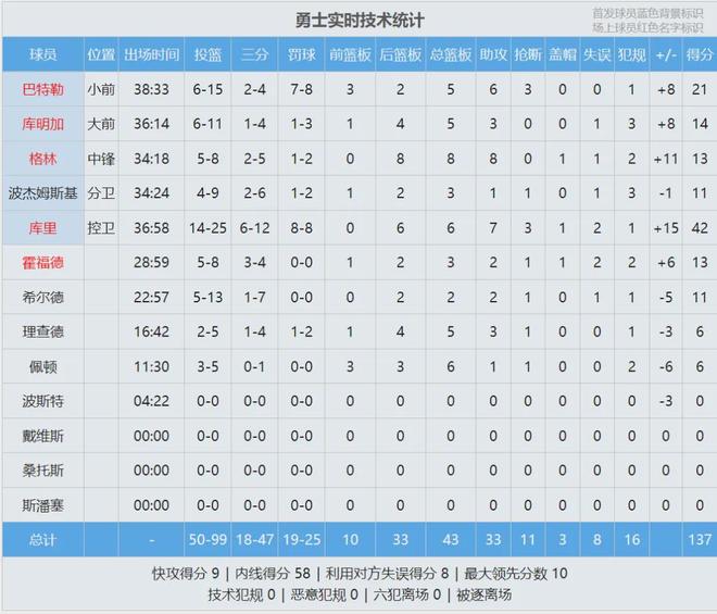这是库里生涯第72次单场40+,在NBA控卫当中排名历史第二,仅次于奥斯卡-罗伯特森(77次)。先来看看本场比赛的数据统计: