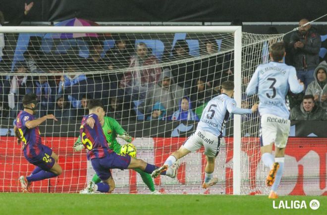 第43分钟,塞尔塔卷土重来,巴萨的防线再次出现漏洞,禁区弧顶无人盯防,伊格莱西亚斯破门得分。
